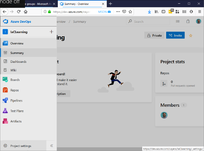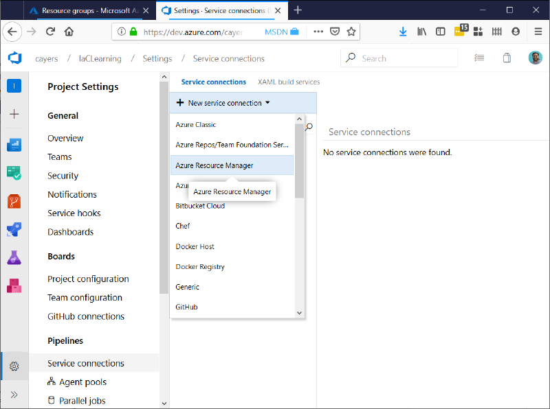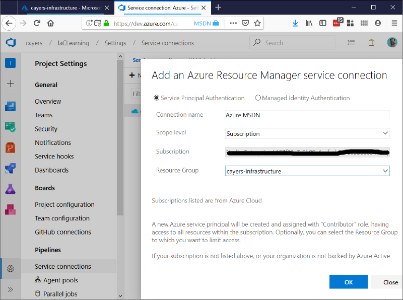 Now we need to make sure DevOps has permission to create and update resources in Azure. This can be done in a few different ways as described here: https://docs.microsoft.com/en-us/azure/devops/pipelines/library/connect-to-azure?view=azure-devops.