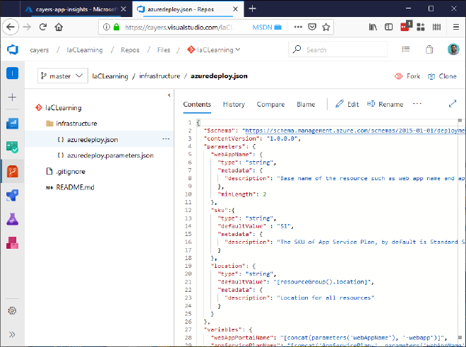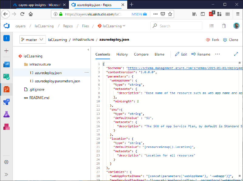 I’ve got a template straight from Microsoft. I want this wired into a CI/CD pipeline to I can play around and get quick feedback. I’m going to use Azure DevOps to help make all this possible. Let’s get those templates into a repository to get started. New repository, initialize it, add new files.