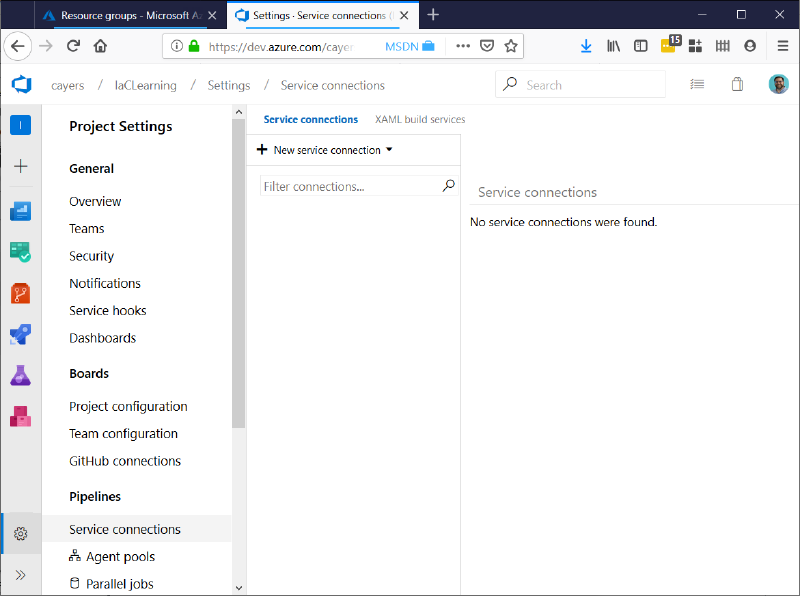 I’m going to setup a service connection from DevOps to Azure. In Azure Devops, I’m going to go to my project settings: