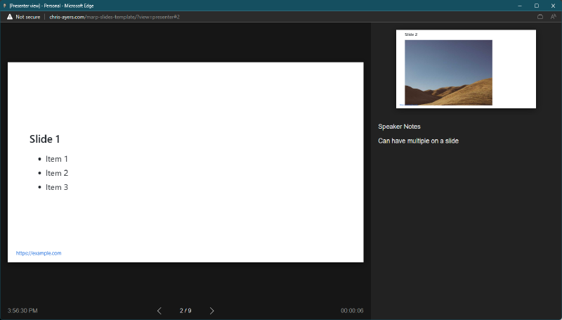 - A new window will open, displaying the current slide, next slide, and speaker notes.