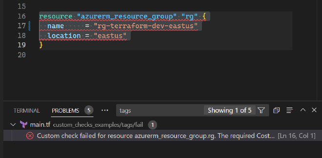 This is saved to .tfsec/custom_tfchecks.yaml. The tfsec vscode extension we installed before will automatically pick up the new rule. We can see it highlighting the code with an issue and showing up in the results screen.