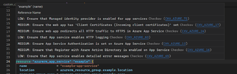 Checkov provides extensions for VS Code and other IDEs, allowing you to scan your Terraform code directly from your code editor. This is a convenient way to scan your code as you write it, ensuring that you don’t introduce any security or compliance issues.