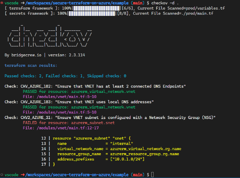Once installed, Checkov provides a command-line interface (CLI) to scan your IaC files. To scan your Terraform code, navigate to your project’s root directory and run the following command: