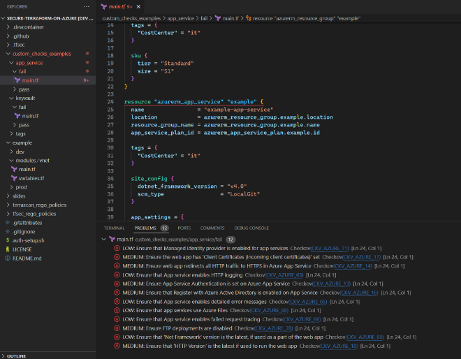 You can scan your code and view the results in the Checkov Output tab. You can also view the results in the Problems tab, which provides a convenient way to navigate to the specific line of code that caused the issue.
